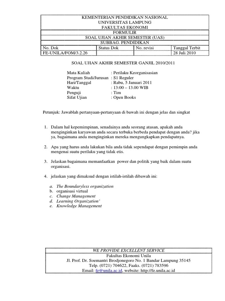 Soal Ujian Perfilaku Organisasi Semester 4 : Bank Soal Himpunan Mahasiswa Jurusan Pendidikan Ekonomi - Kementerian pendidikan nasional universitas lampung fakultas ekonomi formulir soal ujian akhir semester (uas) subbag.